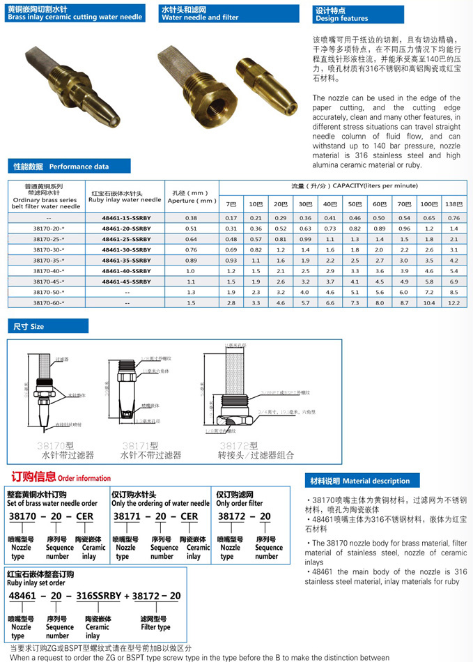 ·The body of 38170 nozzle is made of brass, the filter is made of stainless steel, and the nozzle is made of ceramic inlay